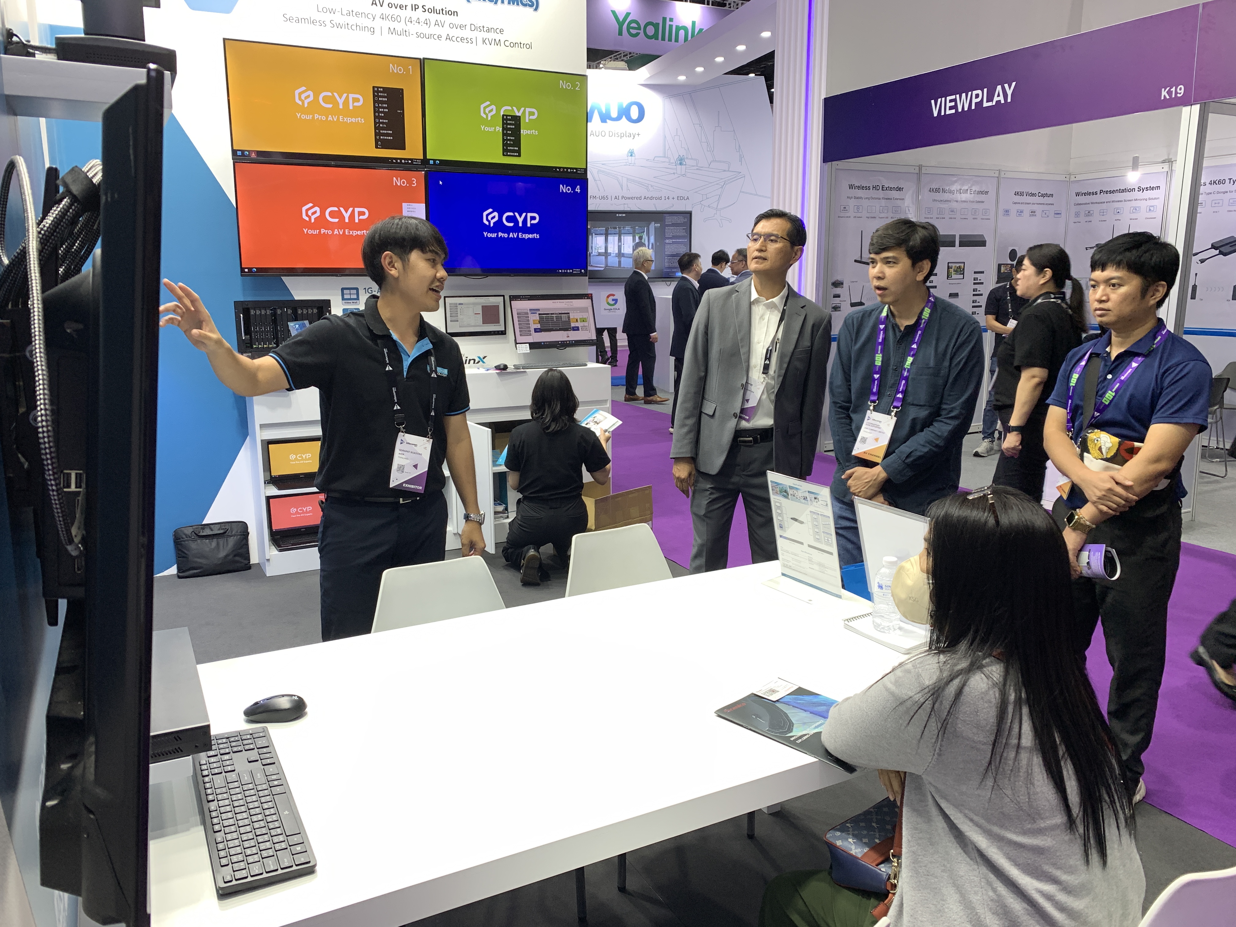 บูธ CYP ในปีนี้ เรานำเสนอโซลูชัน Pro AV ที่ตอบโจทย์ทั้งงานควบคุมและงานประชุมอย่างลงตัว โซลูชัน AVoIP สำหรับระบบ Command & Control ที่มาพร้อมฟังก์ชัน KVM สลับจอได้ด้วย Hotkey และอุปกรณ์ Seamless Matrix 4x4 ที่รองรับ 4K60 พร้อมฟีเจอร์ Video Wall และ Multi-view ในตัว เหมาะกับห้องประชุมยุคใหม่ที่ต้องการแสดงหลายหน้าจอพร้อมกัน