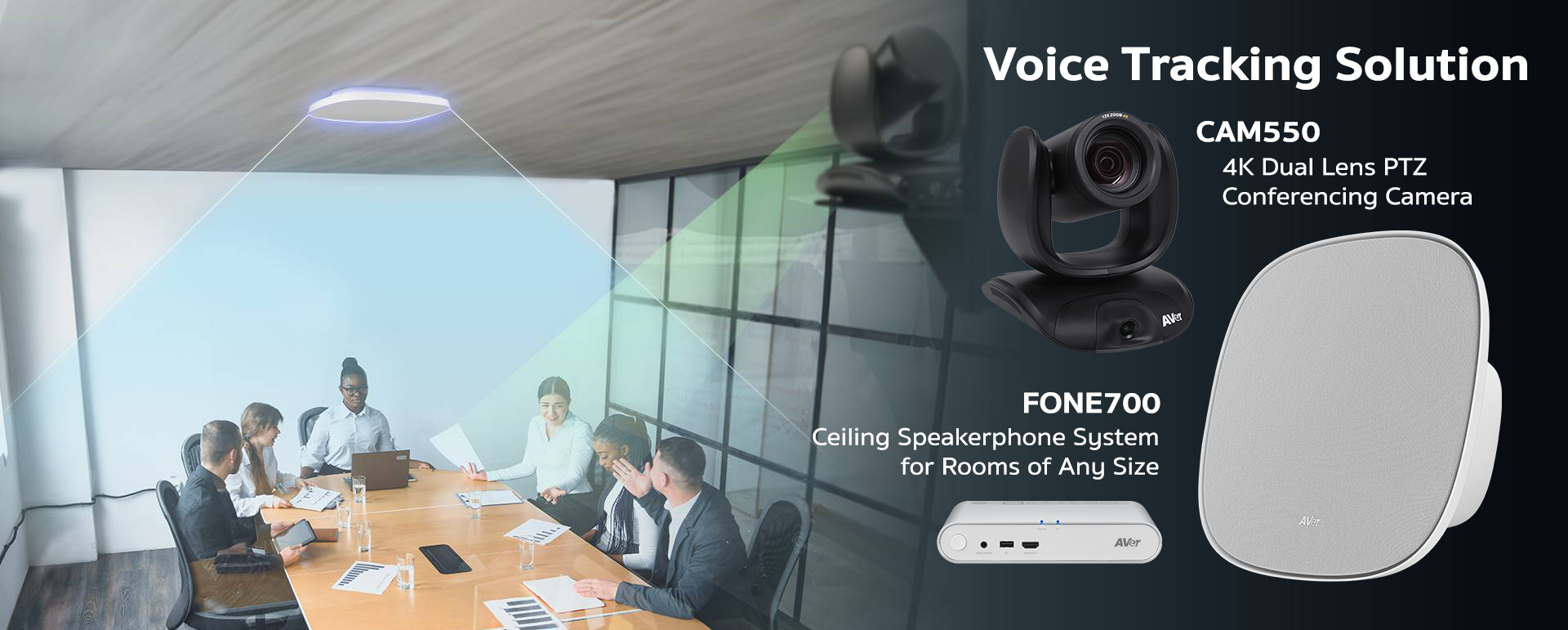 CAM550 และ FONE700 ทำงานประสานกันอย่างไร้รอยต่อ FONE700 สามารถตรวจจับตำแหน่งของผู้พูดได้อย่างแม่นยำ และสั่งให้กล้อง CAM550 ปรับมุมมองโดยอัตโนมัติเพื่อโฟกัสไปยังผู้พูดทันที หมดปัญหาการปรับกล้องด้วยมือ ช่วยให้การประชุมเป็นไปอย่างราบรื่น พร้อมภาพคมชัดและเสียงชัดเจน มอบประสบการณ์การประชุมที่มีประสิทธิภาพและน่าสนใจยิ่งขึ้น