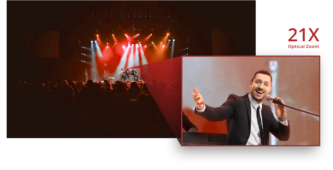 ![]() 21X Optical Zoom & 12X Digital Zoomพลังการซูมของกล้อง PTC320UV2 สามารถซูมได้ถึง 252 เท่า (ซูมออปติคอล 21X และซูมดิจิทัล 12X) สามารถทำงานได้แม้ในขณะที่กล้องกำลังหมุนหรือเอียง ช่วยให้สามารถเน้นเนื้อหาหรือเปลี่ยนมุมกล้องได้อย่างรวดเร็ว คุณสามารถควบคุมการถ่ายภาพที่ใกล้และคมชัดยิ่งขึ้นด้วยฟังก์ชัน PTZ ที่ไม่มีใครเทียบได้ |