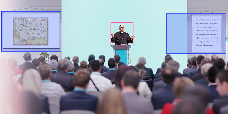 ![]() Zone ModeZone Mode ช่วยเพิ่มความสามารถในการจับภาพเนื้อหาบนหลายจอ โดยสามารถสร้าง Content Zones ได้ถึง 4 โซน เพื่อจับภาพเนื้อหาที่แสดงบนจออย่างสม่ำเสมอ แทนที่จะติดตามการเคลื่อนไหวของผู้พูด |