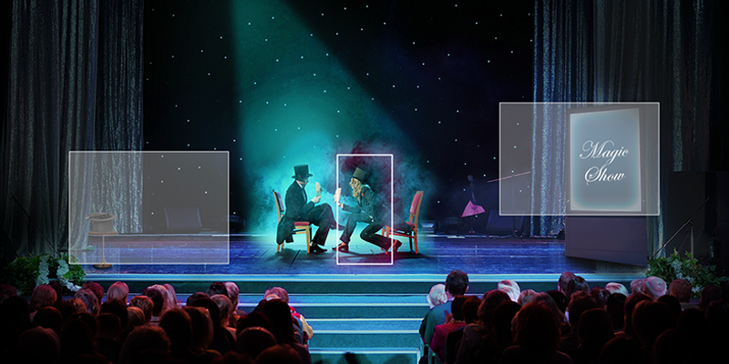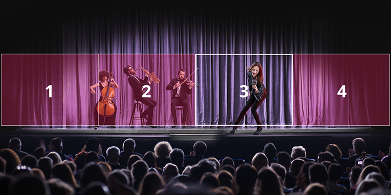 ![]() Hybrid ModeHybrid Mode ให้ความอิสระในการเคลื่อนไหวสูงสุดสำหรับศิลปินหรือผู้แสดง โดยสามารถใช้พื้นที่ที่ตั้งค่าไว้ล่วงหน้าในการติดตามการเคลื่อนไหวและให้กล้องจับภาพมุมมองเต็มของแต่ละพื้นที่ได้อัตโนมัติเมื่อศิลปินเคลื่อนที่ระหว่างพื้นที่ หากศิลปินออกจากพื้นที่ที่ตั้งไว้ กล้องจะเปลี่ยนโหมดไปเป็นการติดตามอัตโนมัติและติดตามศิลปินได้ทุกที่ที่พวกเขาไป |