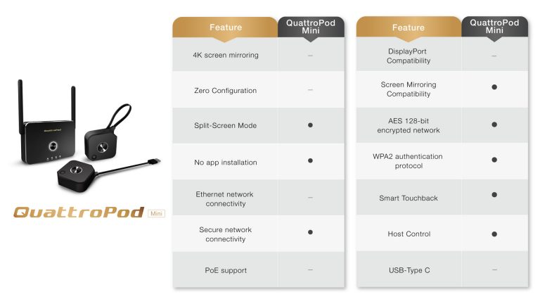 อุปกรณ์แชร์ภาพหน้าจอสุดล้ำสมัยสำหรับห้องประชุม BYOD (Bring Your Own Device) ที่สามารถนำเสนอ Presentation ได้แบบไร้สาย เชื่อมต่อได้กับทุกอุปกรณ์ รองรับการใช้งานทั้งในระบบปฏิบัติการ Windows, Chromebooks, iOS และ Android รองรับความละเอียดสูงสุดถึง 4K Utra HD และยังสามารถแชร์หน้าจอได้พร้อมกันสูงสุดถึง 4 หน้าจอ จากต่างอุปกรณ์ Plug, Click and Cast แชร์หน้าจอได้ง่ายๆ เพียงเชื่อมต่ออุปกรณ์กับตัวเครื่อง ก็ใช้งานได้ทันทีโดยไม่ต้องใช้ Application มาพร้อม Touch Back ควบคุมการประชุมแบบไร้สายกับคอมพิวเตอร์ผ่านหน้าจอสัมผัสของจอแสดงผลที่ตัวเครื่อง ด้วยท่าทางการสัมผัสที่มากถึง 10 รูปแบบ และ 6 ท่าทางกับ Miracast ช่วยให้คุณสามารถควบคุมการประชุมให้ราบรื่นและมีประสิทธิภาพมากยิ่งขึ้น