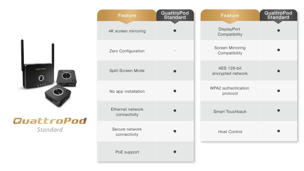 อุปกรณ์แชร์ภาพหน้าจอสุดล้ำสมัยสำหรับห้องประชุม BYOD (Bring Your Own Device) ที่สามารถนำเสนอ Presentation ได้แบบไร้สาย เชื่อมต่อได้กับทุกอุปกรณ์ รองรับการใช้งานทั้งในระบบปฏิบัติการ Windows, Chromebooks, iOS และ Android รองรับความละเอียดสูงสุดถึง 4K Utra HD และยังสามารถแชร์หน้าจอได้พร้อมกันสูงสุดถึง 4 หน้าจอ จากต่างอุปกรณ์ Plug, Click and Cast แชร์หน้าจอได้ง่ายๆ เพียงเชื่อมต่ออุปกรณ์กับตัวเครื่อง ก็ใช้งานได้ทันทีโดยไม่ต้องใช้ Application มาพร้อม Touch Back ควบคุมการประชุมแบบไร้สายกับคอมพิวเตอร์ผ่านหน้าจอสัมผัสของจอแสดงผลที่ตัวเครื่อง ด้วยท่าทางการสัมผัสที่มากถึง 10 รูปแบบ และ 6 ท่าทางกับ Miracast ช่วยให้คุณสามารถควบคุมการประชุมให้ราบรื่นและมีประสิทธิภาพมากยิ่งขึ้น